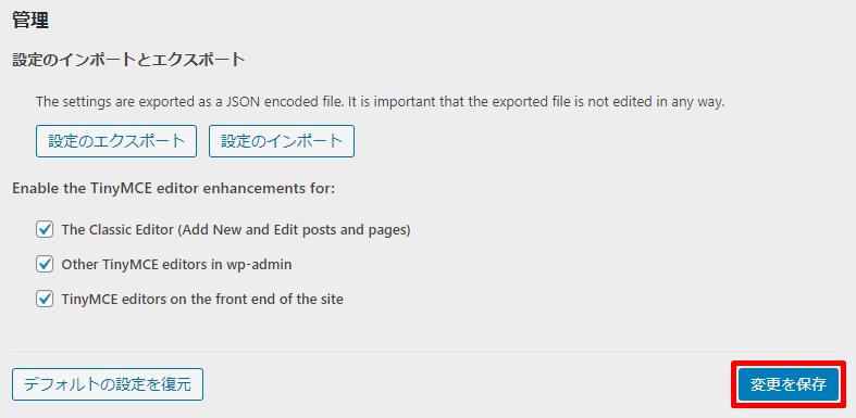 ここまででTinyMCE Advancedプラグインの設定は完了ですので、最後に変更を保存をクリックしましょう。