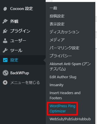 ダッシュボードの設定の中にあるWordPress Ping Optimizerをクリックします。