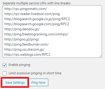 ping送信の入力窓にping送信先サーバーにて紹介しているpingサーバーをコピー・アンド・ペーストして、Save Settingsをクリックして保存します。