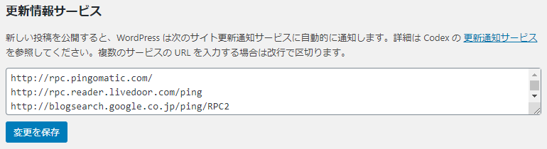 WordPress側のping送信先はダッシュボードの設定の中にある投稿設定にて更新情報サービスとして保存されていますが、ここの更新情報サービスと先程のWordPress Ping Optimizerプラグインのping送信先リストはリンクしています。