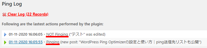 ちなみに、ダッシュボードの設定の中にあるWordPress Ping Optimizerを開いたところにPing LOGという項目があります。