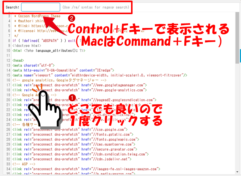 header.phpを開けたら、コード内をどこでも良いので一度クリックしControlFキーを押して検索窓を表示させます。(Macの場合はCommandFキー)
