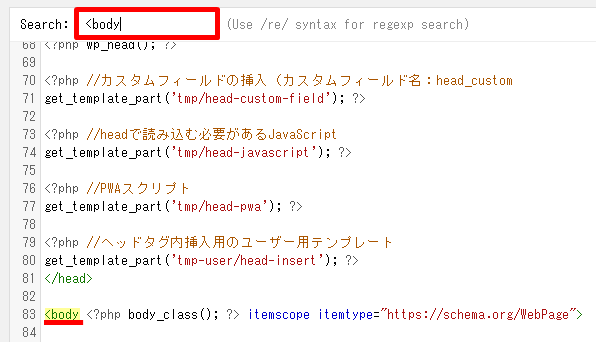 <body>ではなく<bodyで検索する理由は、テーマによっては上記画像のように<body>タグ内に別の要素を書き込んでいる場合があるためです。