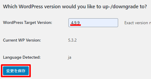 WordPress Target Version:に先程メモしたダウングレードしたいWordPressバージョンを入力し、変更を保存をクリックします。