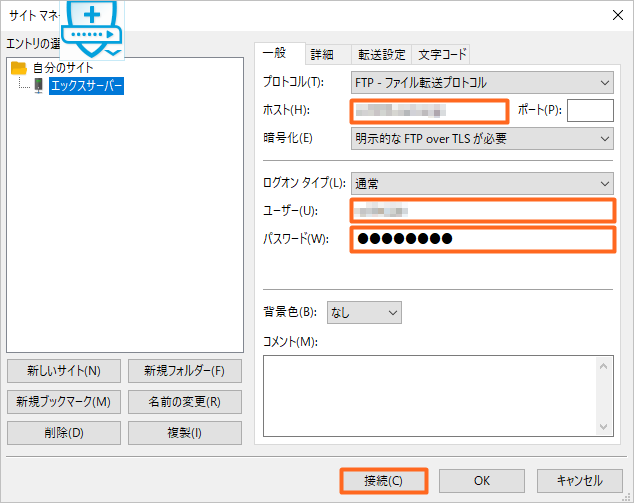 ここに、先程確認した「FTPホスト名」「FTPユーザー名」「FTPパスワード」を入力して、最後に接続をクリックします。