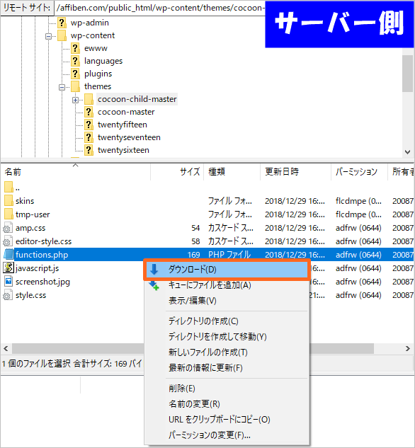 - FTPソフトで編集対象のファイルをローカルPCへダウンロードする