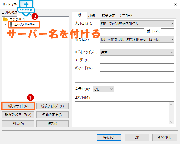 新しいサイトをクリックして、「契約しているサーバー名」を入力します。(正式名称である必要はありません)