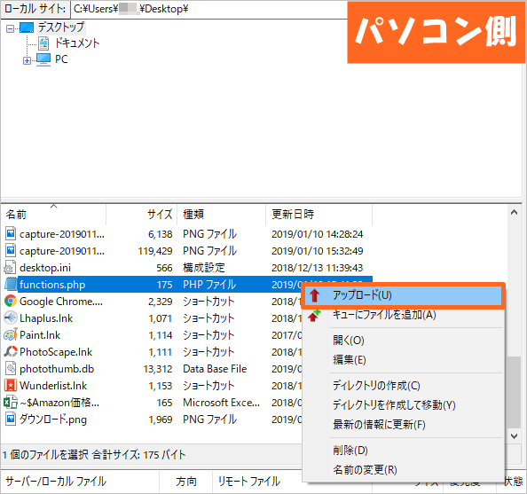 パソコン内のデータ一覧から、サーバーにアップロードしたいファイルを探して、右クリック→アップロードをクリックします。