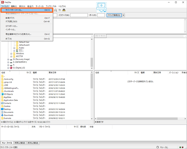 まずはFileZillaを起動して、ファイルの中にあるサイトマネージャーをクリックします。